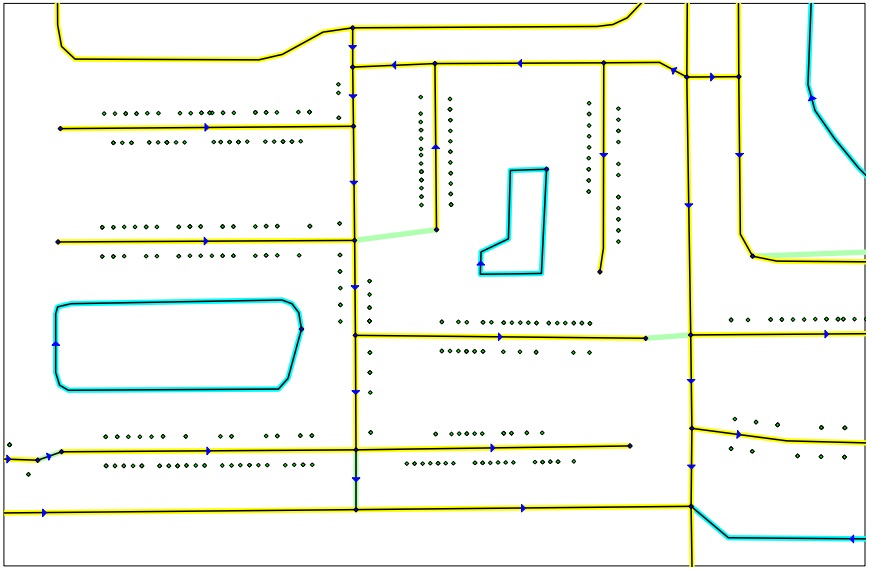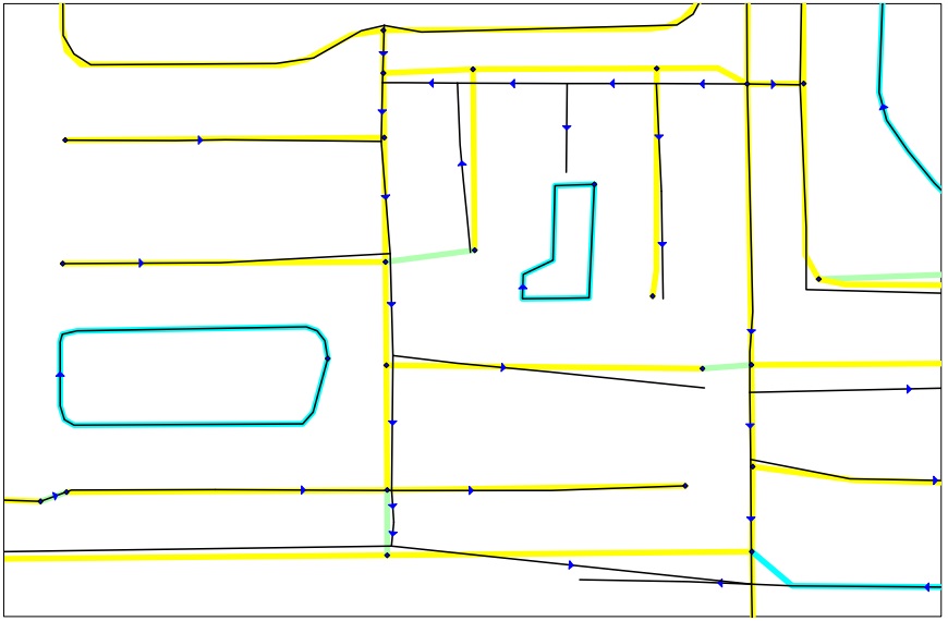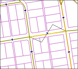 While not illustrated, similar to the Change Name, the MultiUpdate function allows the user to Change Names, ZIP Codes, MTFCC and Revert Graphics. Below is an example of the Change Attributes dialog box. One can update a segment at a time. Both update Address ranges, ZIP Codes and the MTFCC values change also be update. ![]() | Below is an example of the Trace function. The yellow line represents the proper base line we want to conflate with. The second line is our TIGER, which we are going to adjust. Select yellow line and activate the Trace function.