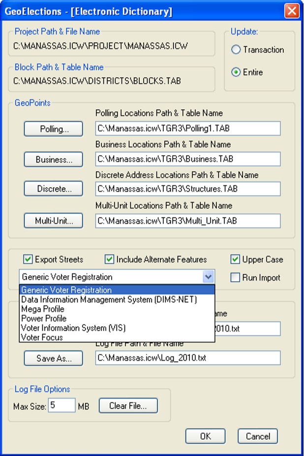 Using the GeoElections – [Electronic Dictionary] dialog box the user can select the data output that targets the unique demands of the voter registration system implemented in their jurisdiction.